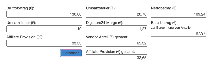 Steuer- und Provisionsrechner von Digistore24 für Berechnung von Steuer, Marge, Anteile und Affiliate-Provisionen: https://docs.digistore24.com/knowledge-base/digistore24-steuer-und-provisionsrechner/